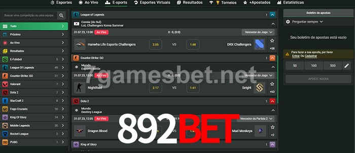 O 892Bet oferece uma grande seleção de opções de apostas em e-sports com probabilidades competitivas